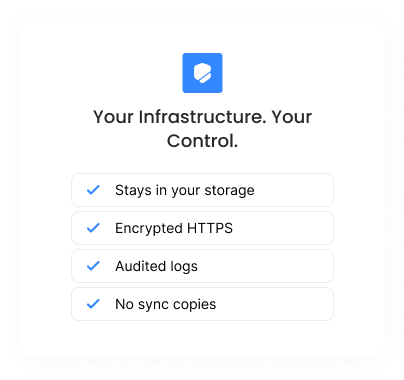 Access is delivered over encrypted HTTPS with full logging and policy enforcement. No third-party cloud stores your data. No sync copies.