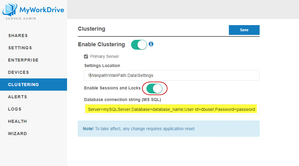 6. Edit the other MyWorkDrive servers in the cluster and enable the Sessions and Locks feature and apply the appropriate connection string to each of them.