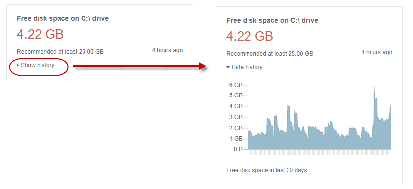 Note any items that report warnings or errors in red. Click for details on links like Show History, Show Details, and See More to get additional information about the problem.