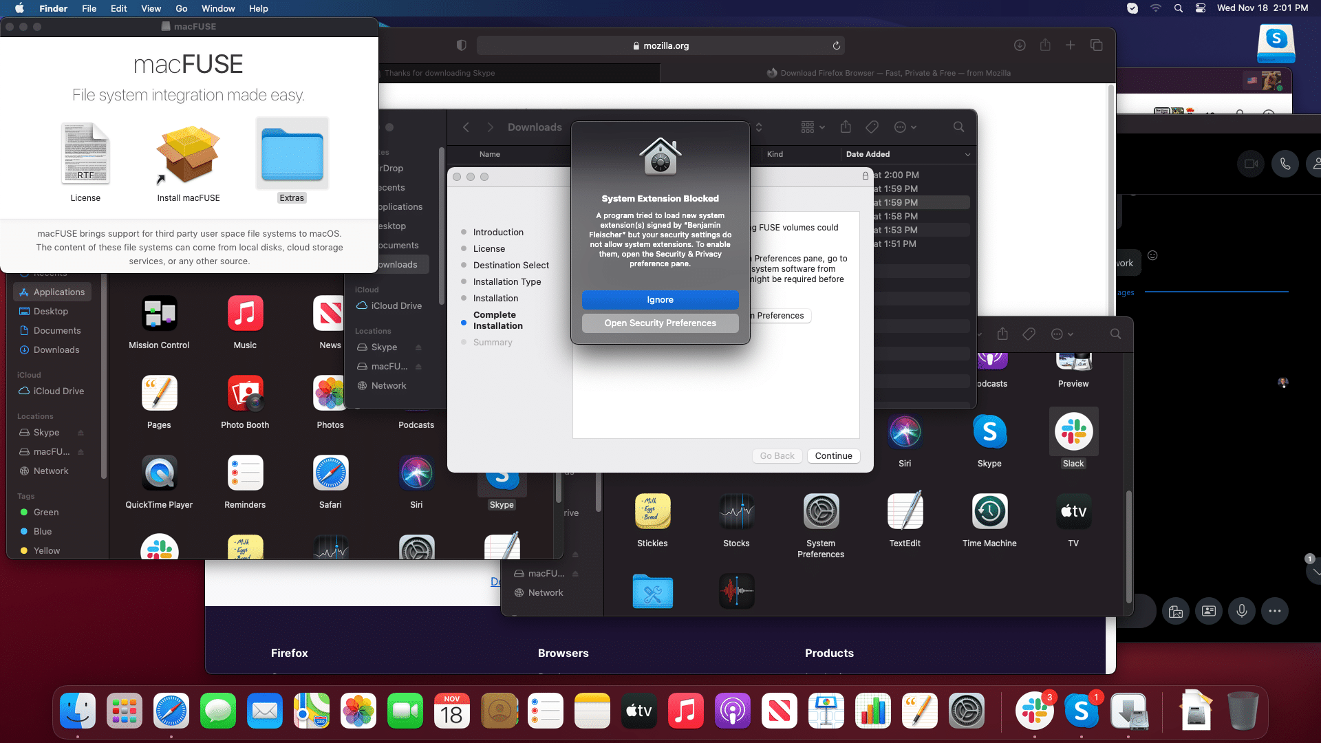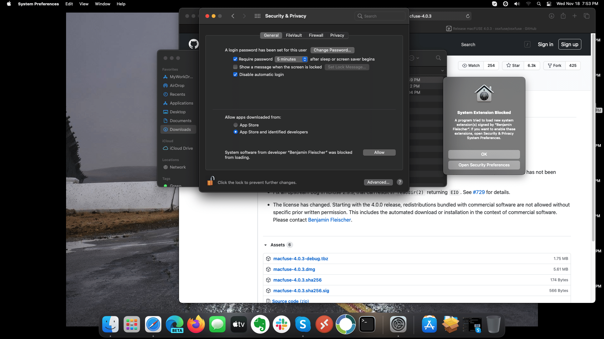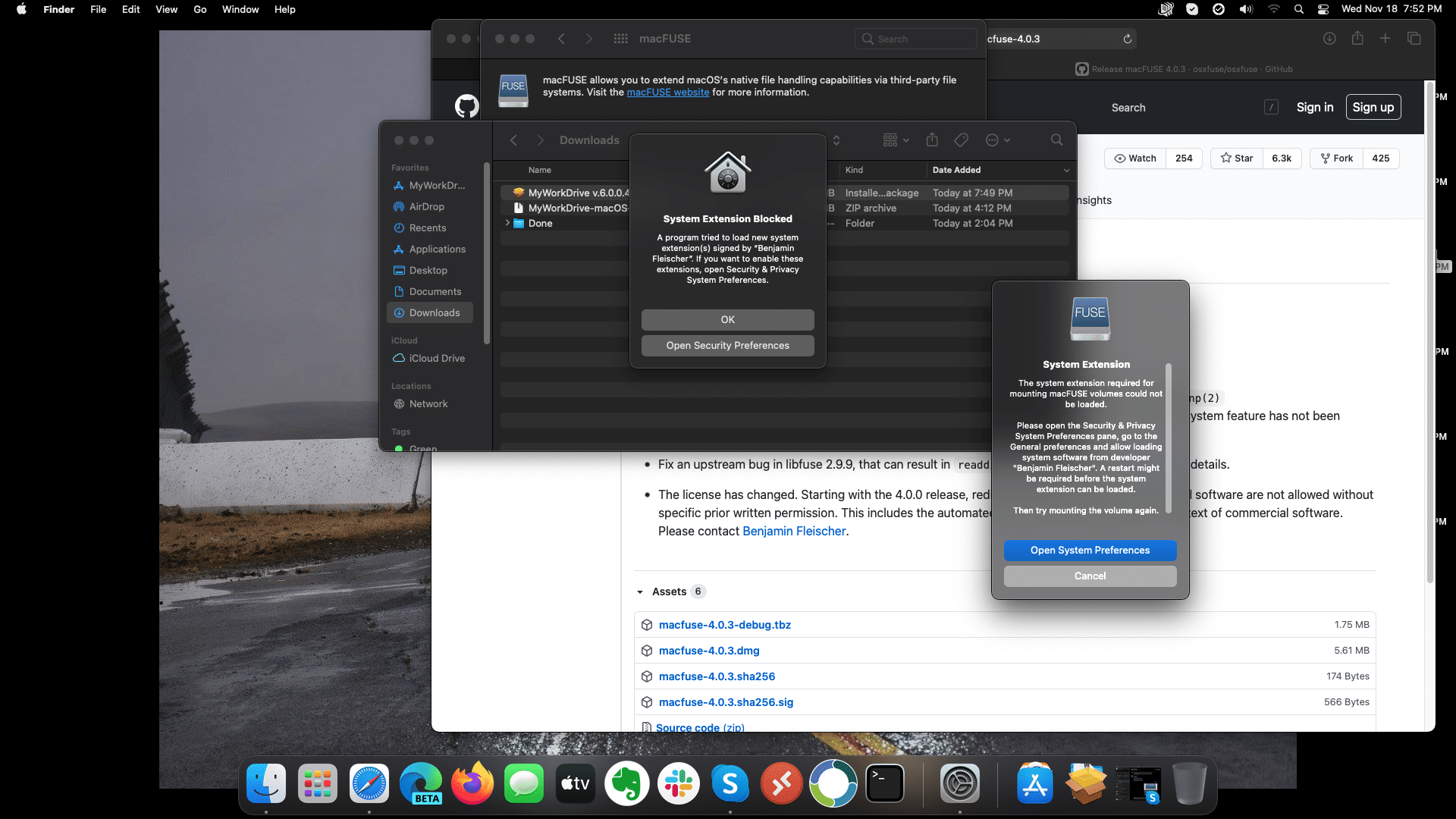 During the installation process, you will receive multiple warnings that the macFUSE extension by Benjamin Fleischer (the owner of macFUSE) cannot be loaded.