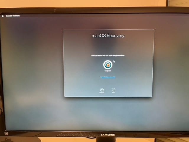 As noted, you will need to shut down (you can click the shutdown button), and then you'll need to power back on by holding the TouchID or power button until the system boots into the Recovery Environment. You will be prompted to select your admin user and enter your system admin password to log in to the recovery Environment.