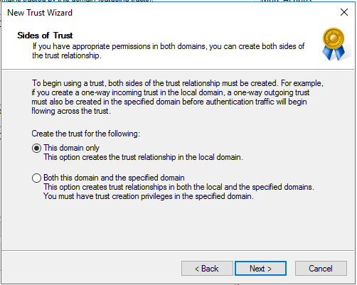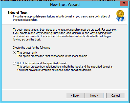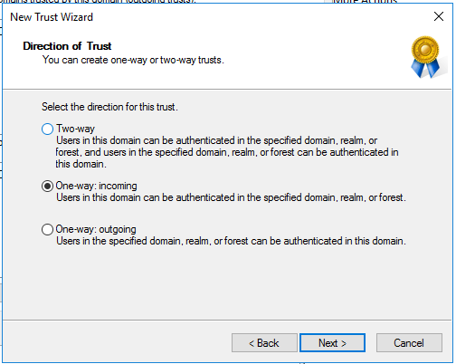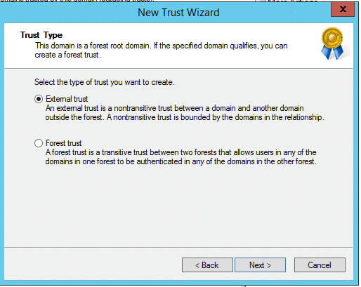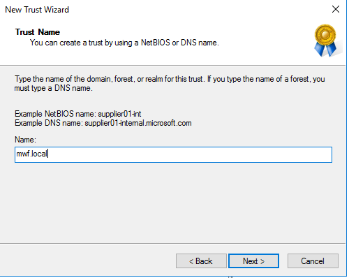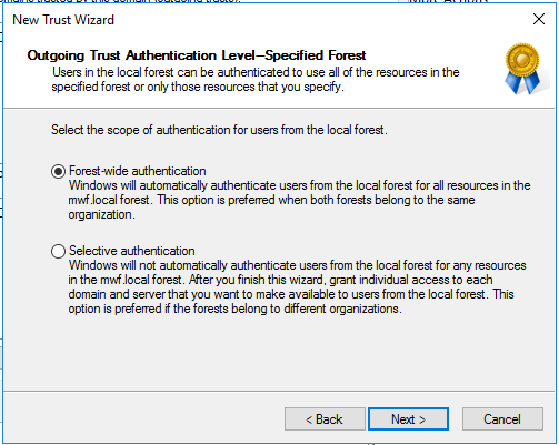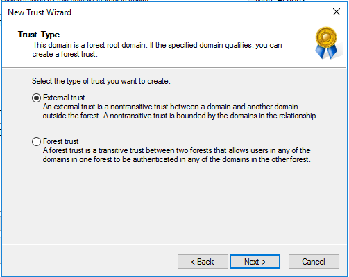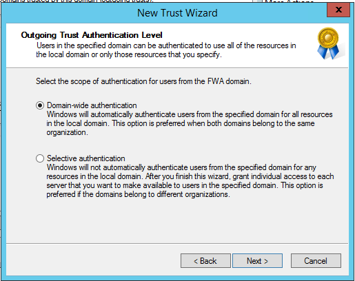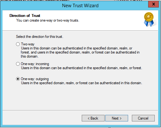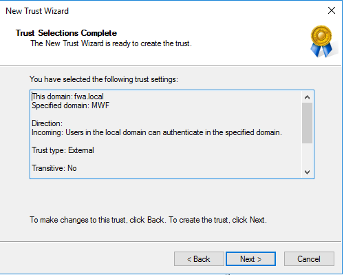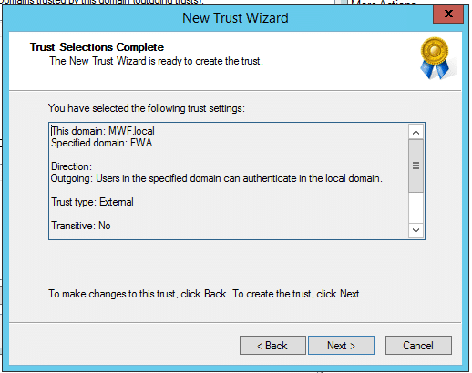 In this case, we set up a one-way outgoing trust to the MWD resource domain using an external domain trust.