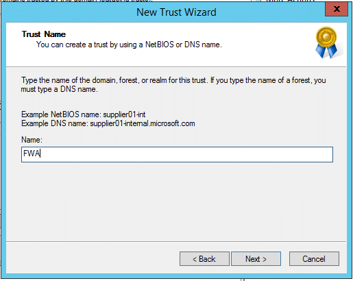 This is created from the perspective of the FWA Trusted Account domain DC to trust the resource domain.