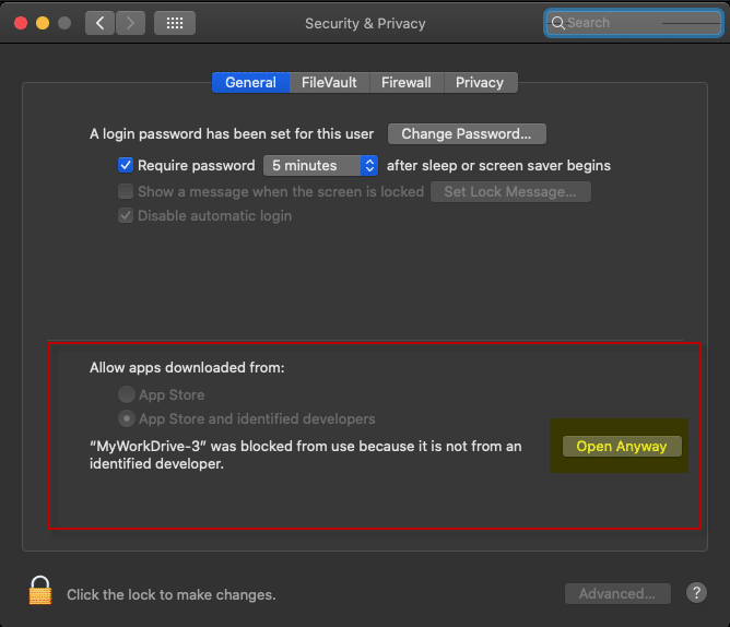 In the bottom area with the prompt "Allow apps downloaded from", adjacent to the note about MyWorkDrive, click the "Open Anyway" button. If the open anyway button does not appear, or MyWorkDrive is not listed there, you may need to click the Unlock button lower left prior to being able to make any changes.
