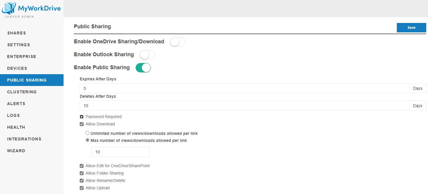 Administrators can control which shares and users are permitted to use Public Sharing through the MyWorkdrive granular permission system on share configuration. Additionally, administrator restrictions on public links include download permissions, password requirements, and expiration requirements. Administrators also have access to Public Sharing links users have created, with the ability to change/delete them as required.
