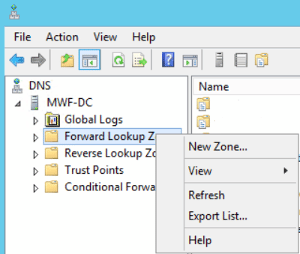 - Expand your DNS Server name, right-click on Forward Lookup Zones, and select New Zone.
