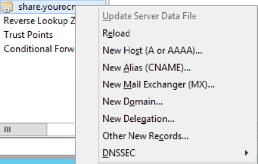- Expand Forward Lookup Zones, browse to the new zone we just created, right-click on the zone, and select New Host (A) record.