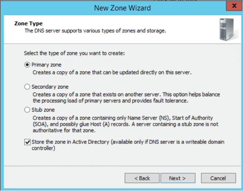 - Select Next on the welcome page, select Primary Zone, and decide if you want to store the zone in AD (the last checkbox). Select Next.