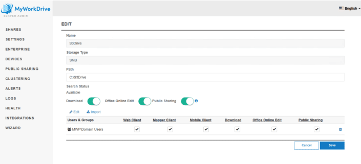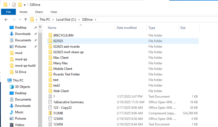 MyWorkDrive does not require any direct integration, file migration, or synchronization with your S3 bucket. Instead, S3 Drive maps the S3 bucket to a folder on your MyWorkDrive server, which is then shared with users using standard SMB (Local) share mounting.