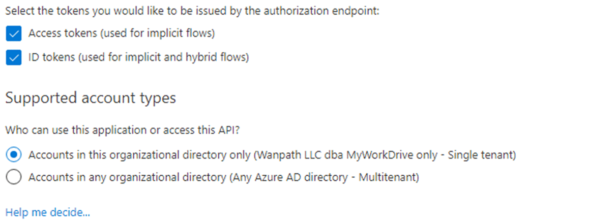 Provide a _Name_, _Supported Account Type_, and include your public MyWorkDrive URL with the subsite "/GraphApiTokenPage.aspx".