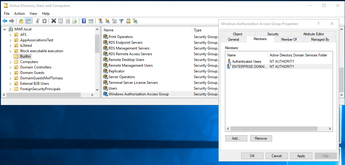 Add-ADGroupMember -Identity "Pre-windows 2000 compatible access" -Members "MWDServer$"