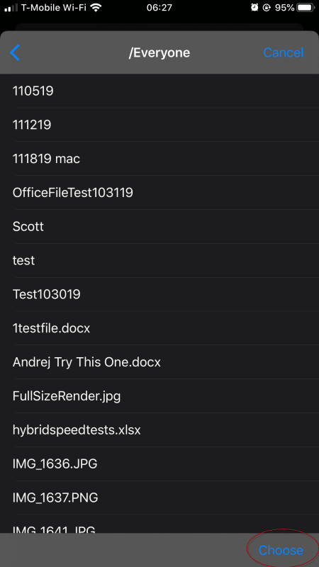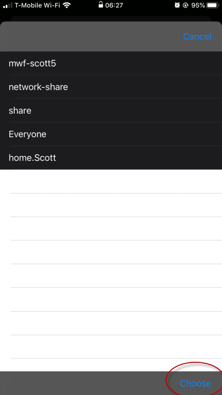 You'll be shown a list of shares available to you, select the appropriate location and tap Choose in the bottom right.