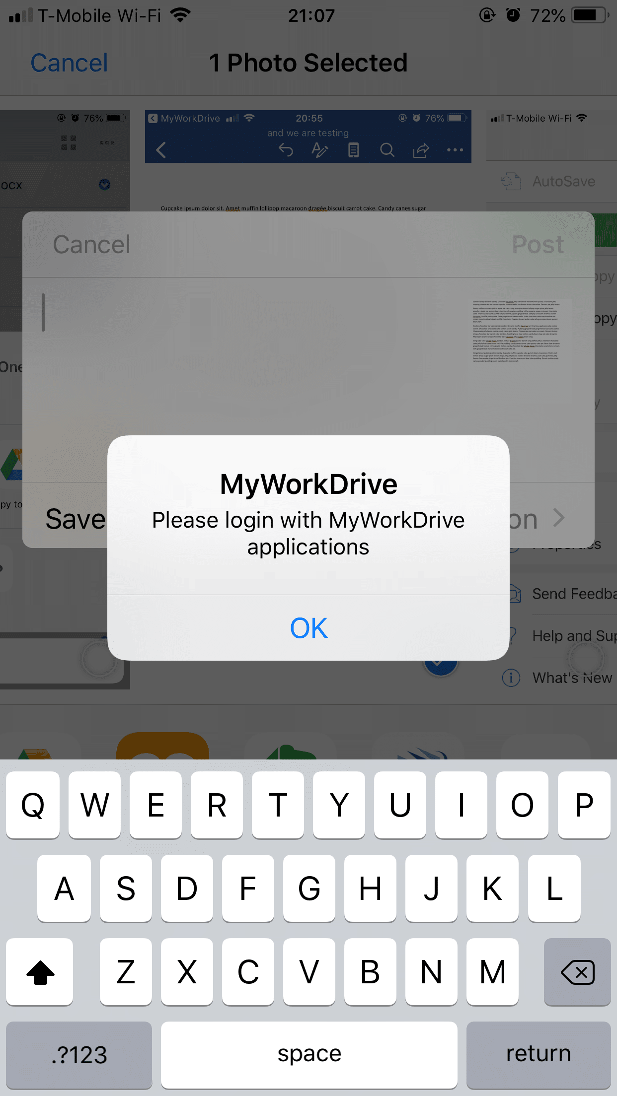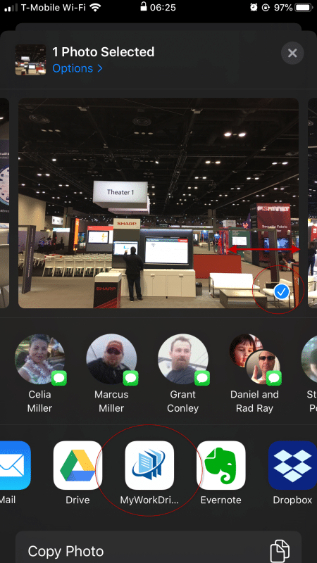 On the upload screen, you can scroll through your photos and pick additional images. When you have the appropriate image(s) selected, use the slider to select MyWorkDrive from the applications list.