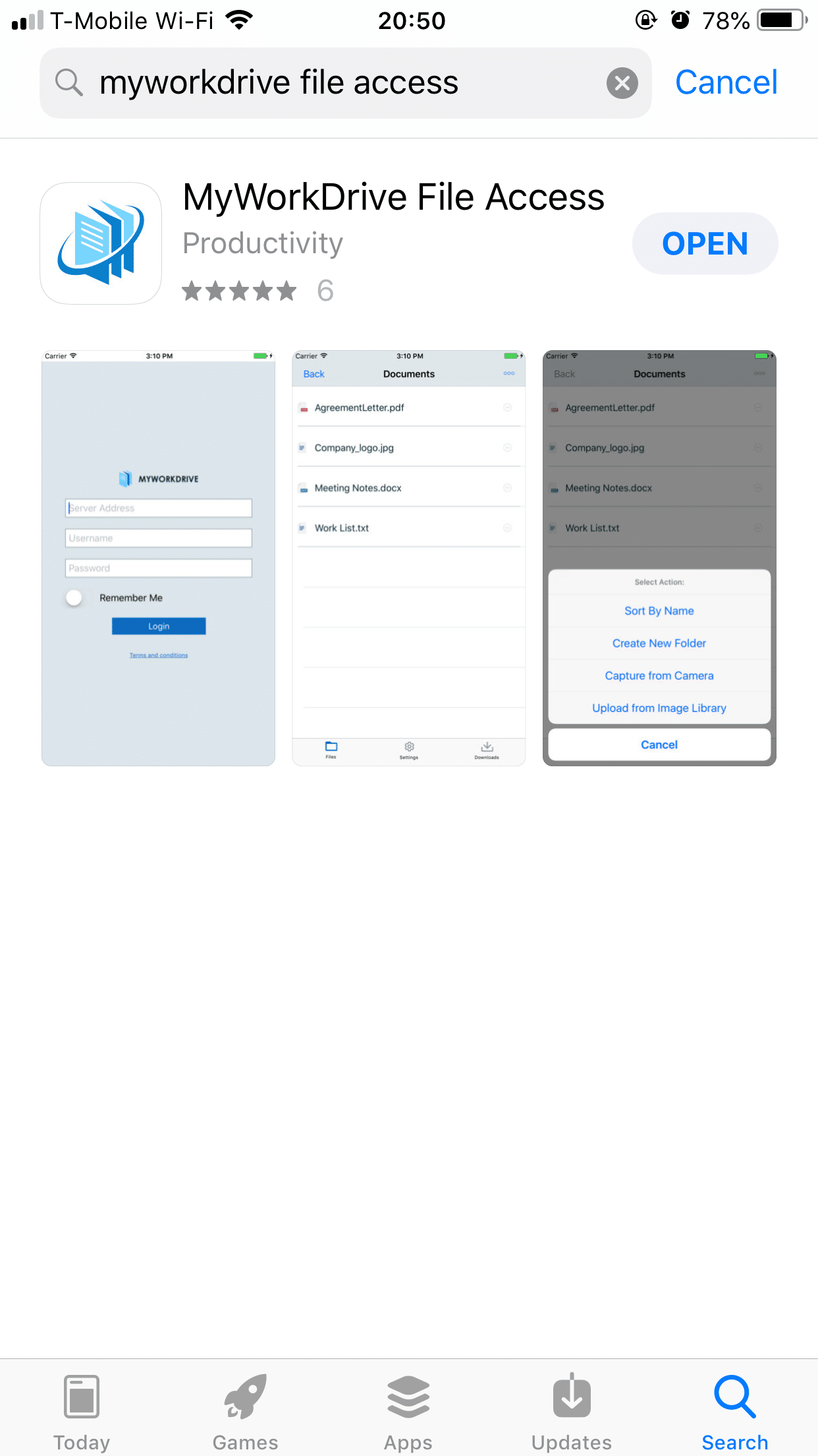 iOS App Installation MyWorkDrive is available in the Apple App Store, just search for "MyWorkDrive" to find it for install.