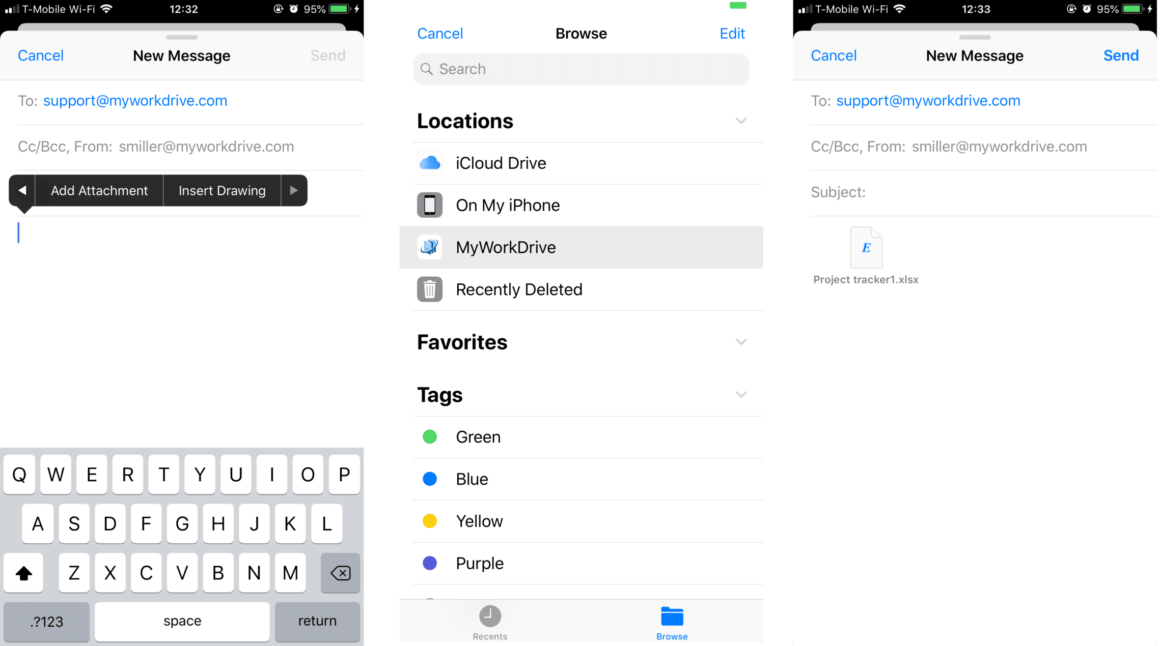 It's easy to attach a file from MyWorkDrive to an email you are composing. Long-press the white space in your email, then select "add attachment" from the black options ribbon which appears. In the window that opens, choose MyWorkDrive from the locations. Browse to your file and select it. Your file will be dropped into your email.