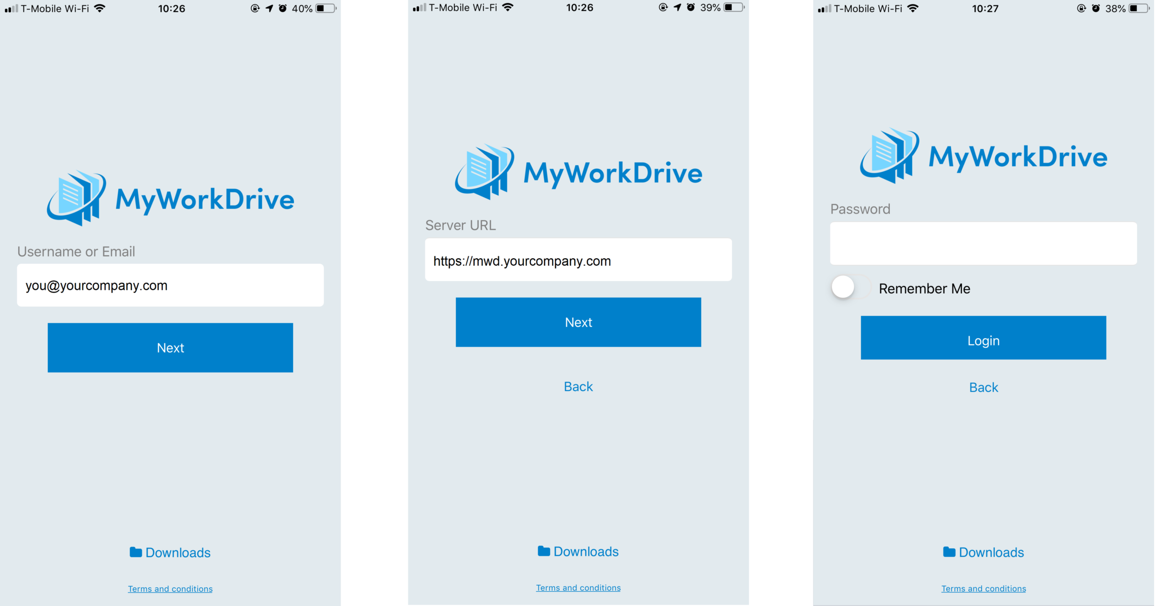 If your administrator has configured email lookup, the MyWorkDrive App will automatically look up your login server for you based on your email address. If not, you will be prompted to enter your server URL. You'll then either be prompted to enter your password or redirected to your company's SSO, if so configured by your administrator.