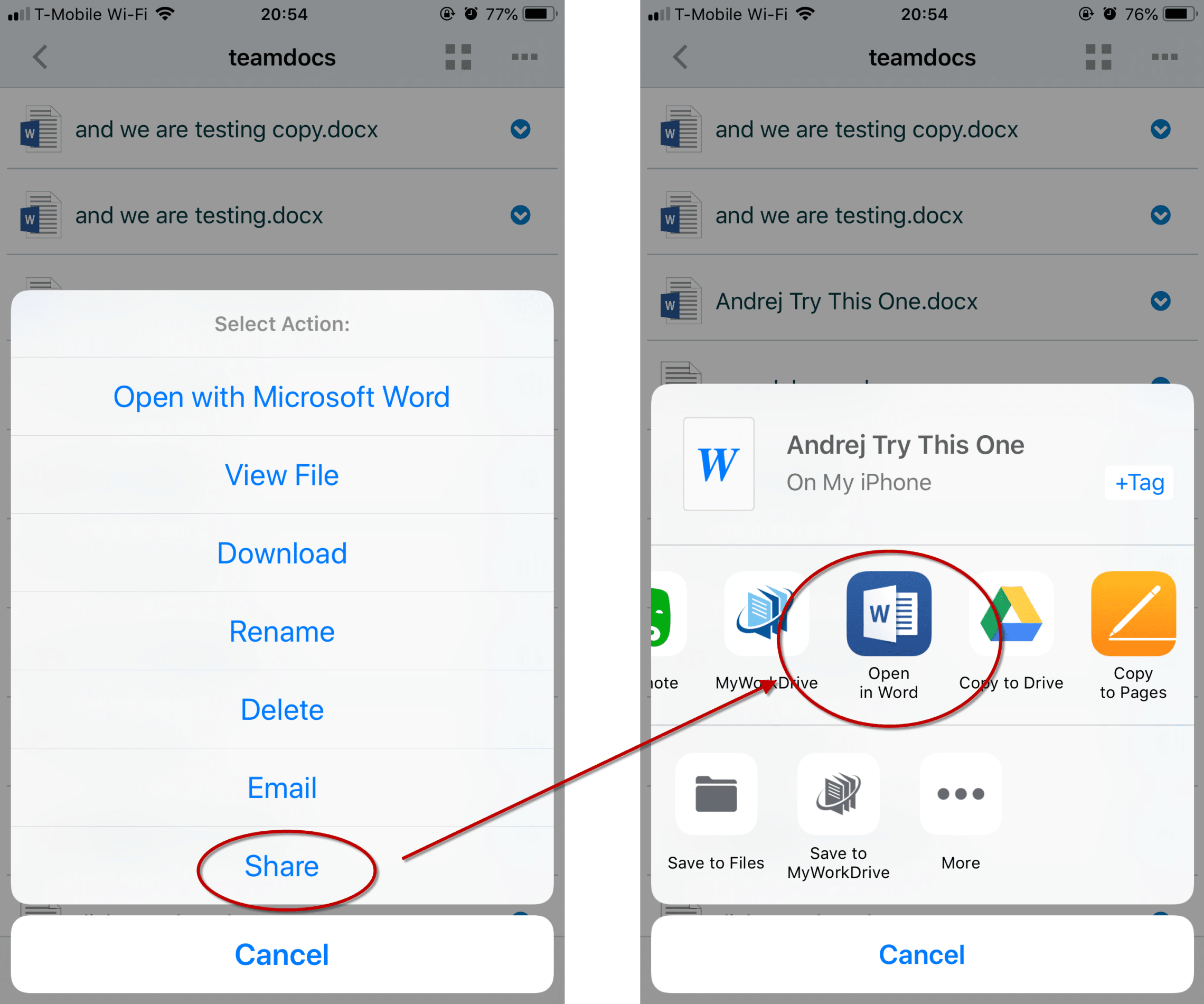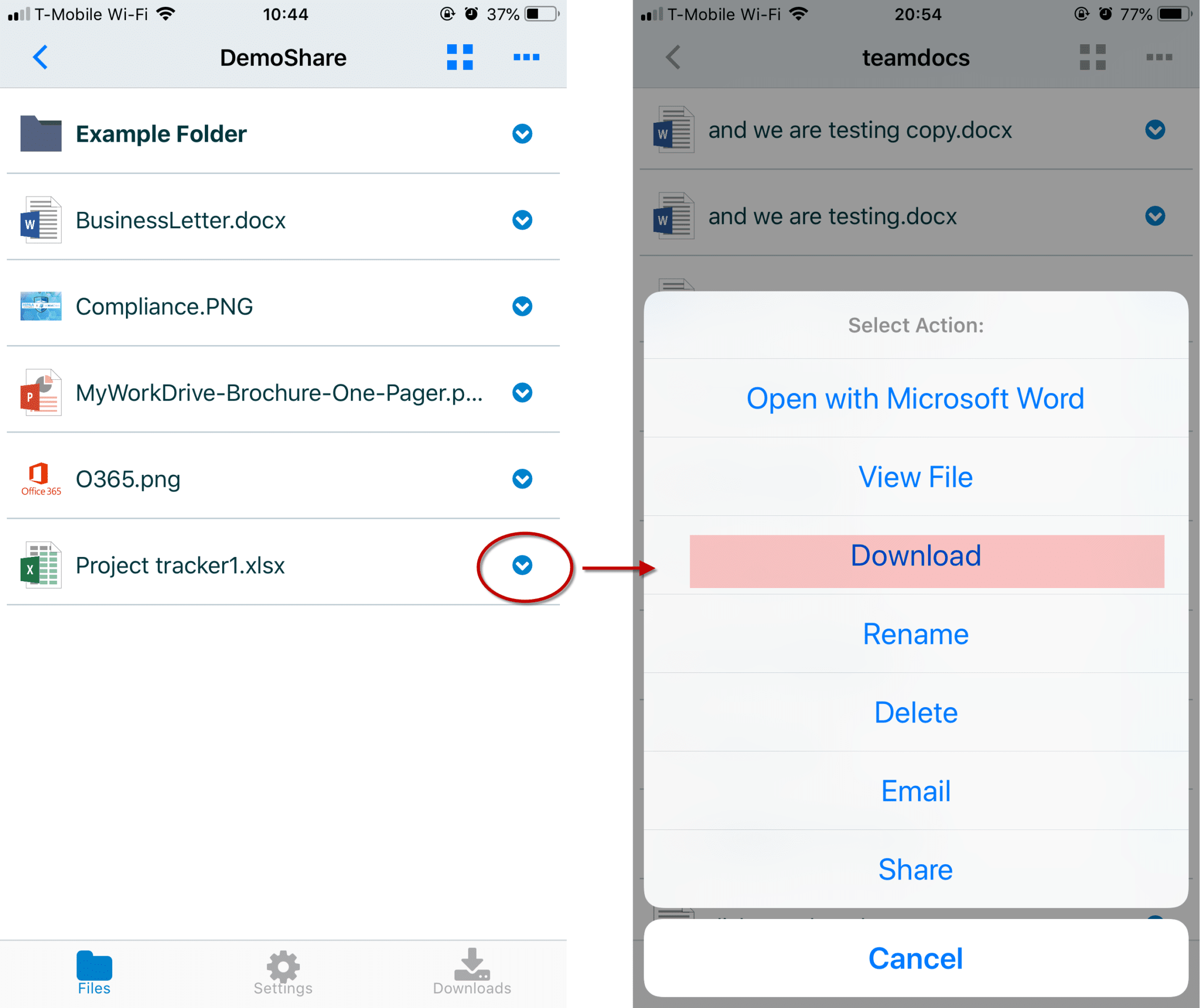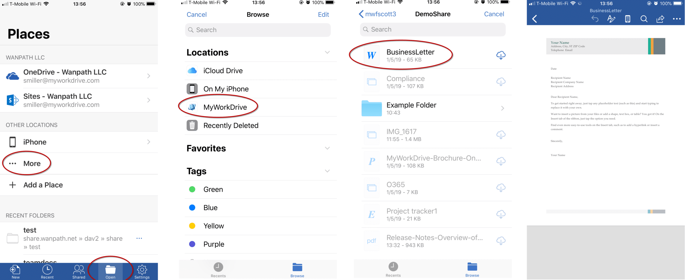 On iPhones and iPads, in iOS, you can enable MyWorkDrive as a location in the Files app. This allows you to open files from MyWorkDrive in applications like Word and Excel, which support the iOS My Files app.