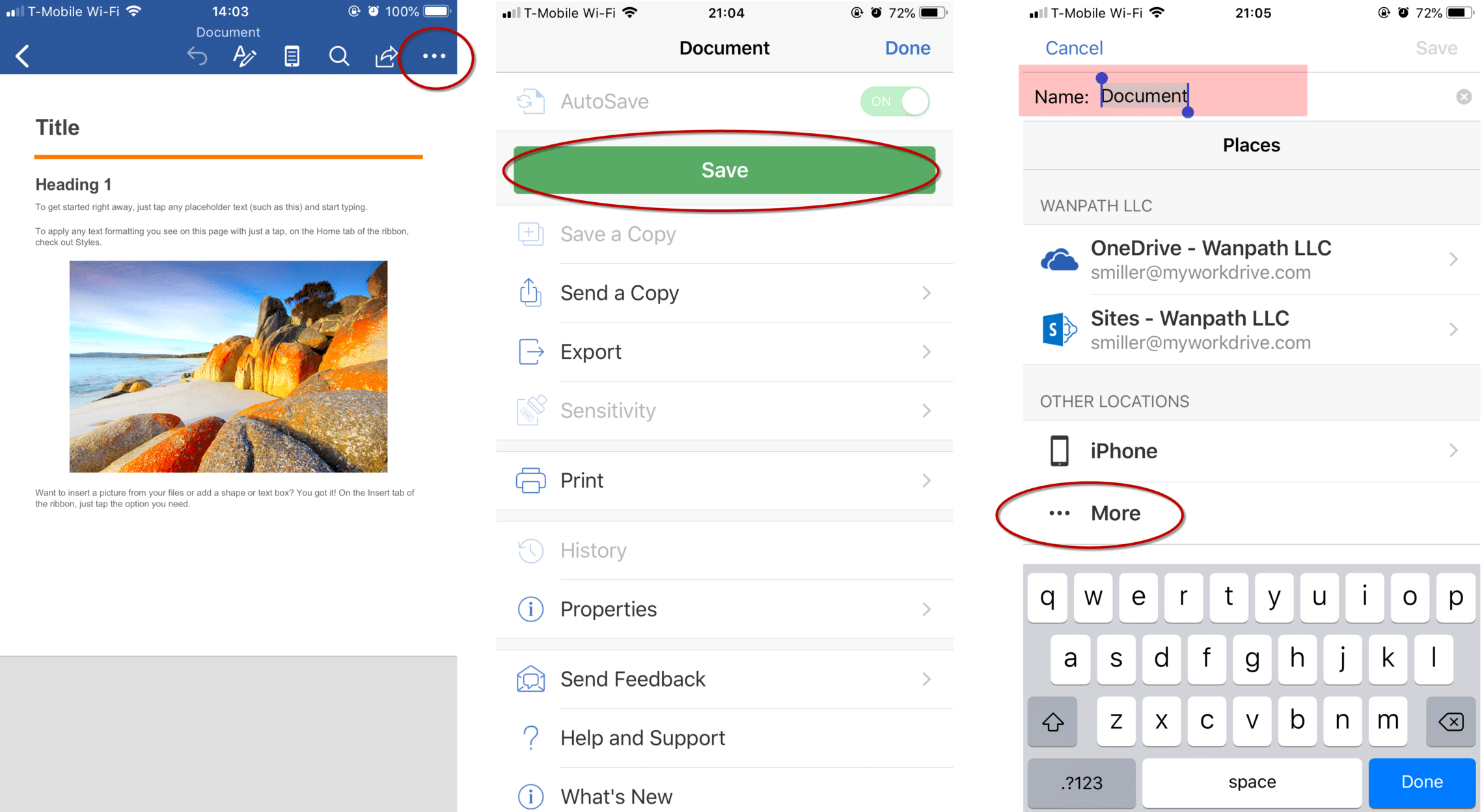 From the three-dot "more options" menu in Office, choose Save. Name your document and scroll down to "other locations" and choose More. Choose MyWorkDrive from the list and then choose the appropriate folder location, then click Move at the top right. Your file will be saved to MyWorkDrive