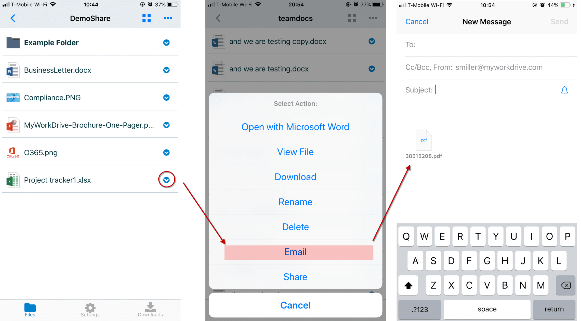 Emailing a file is easy with MyWorkDrive. Just open the Action menu for the file and choose email. An email will be launched for you to compose with the file attached.