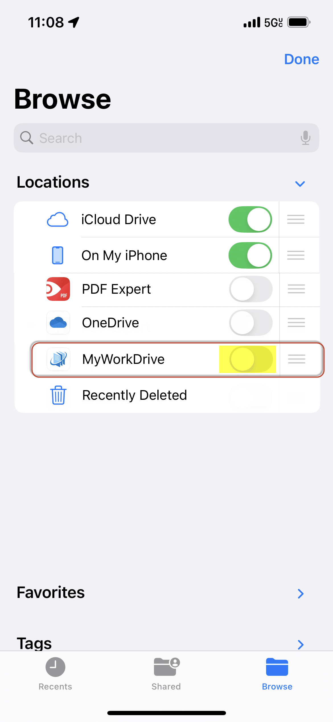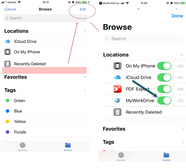 Wrapping up, most importantly, if for some reason you do not see MyWorkDrive listed as an option in your Locations list, open the iOS Files app, then click on Edit on the location list screen and use the slider to turn it on. You'll be all set!