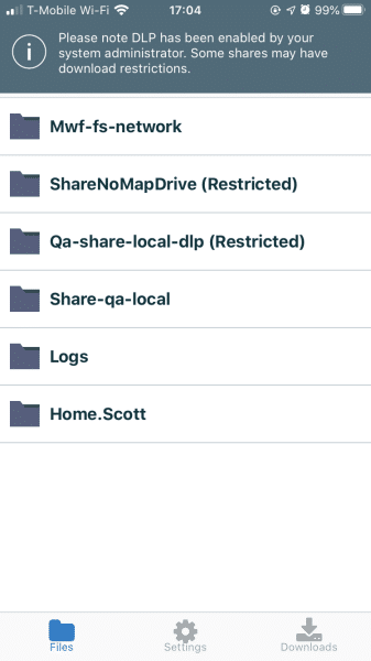 With the introduction of server version 6, using the latest MyWorkDrive mobile client from the store, shares with both download and document editing restrictions enabled with DLP are viewable inline in the Mobile client.