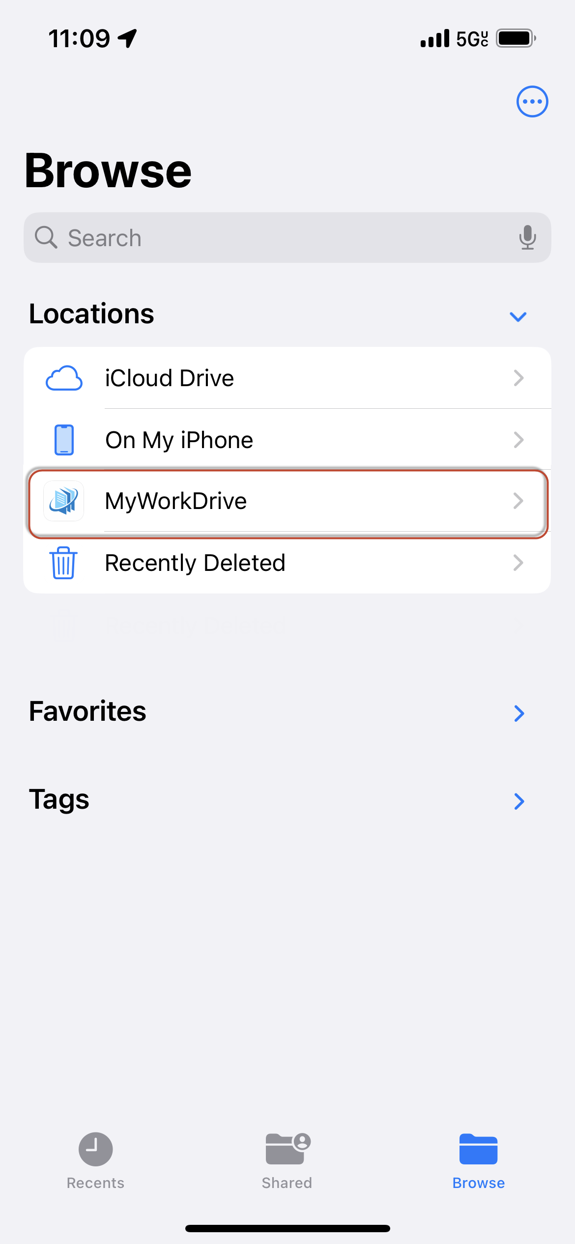 You will see MyWorkDrive in the list of available locations, and it can be used in the Files app and in applications that support MyFiles.